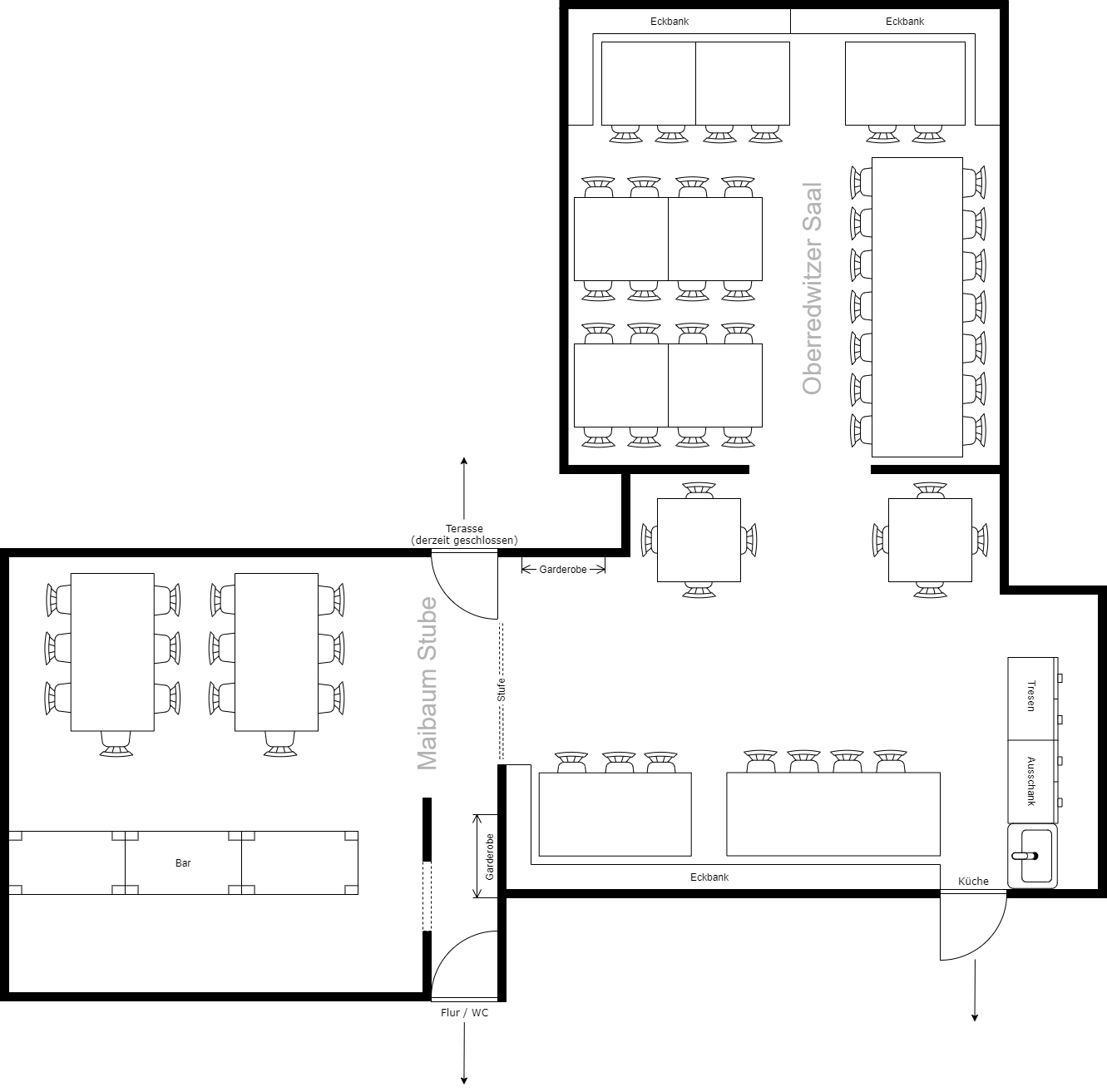 Der Festsaal eignet sich hervorragend für größere Feiern bis max. 80 Personen. Er ist aufgeteilt in die kleinere „Maibaum-Stube“ mit Bar und dem größeren „Oberredwitzer Saal„. Im Bereich dazwischen befindet sich Ausschank und Tresen. Eine größere Fläche für flotte Tanzeinlagen steht ebenfalls zur Verfügung.
